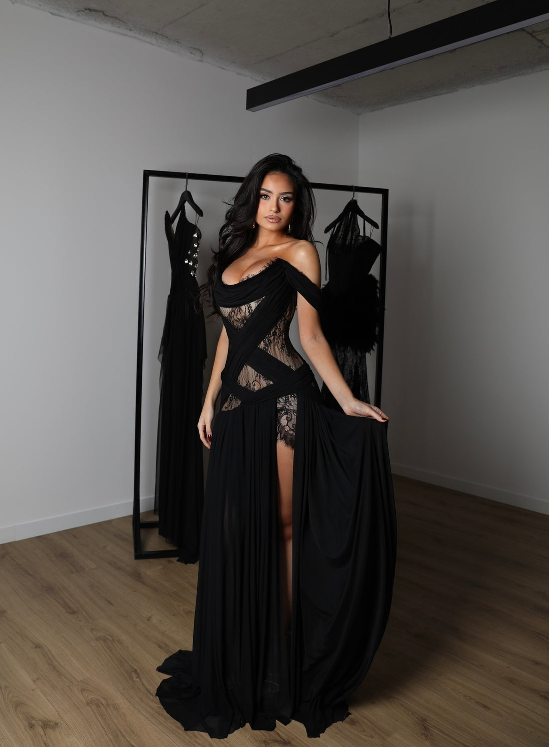 Long Dress Off-shoulder draped neckline with soft gathered black chiffon Corset fully overlaid with...