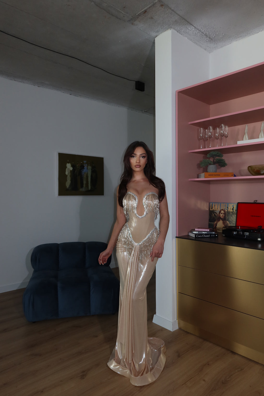 Strapless Long Dress Deep sweetheart neckline with cut out Fitted bodice Crystal fringe details at...