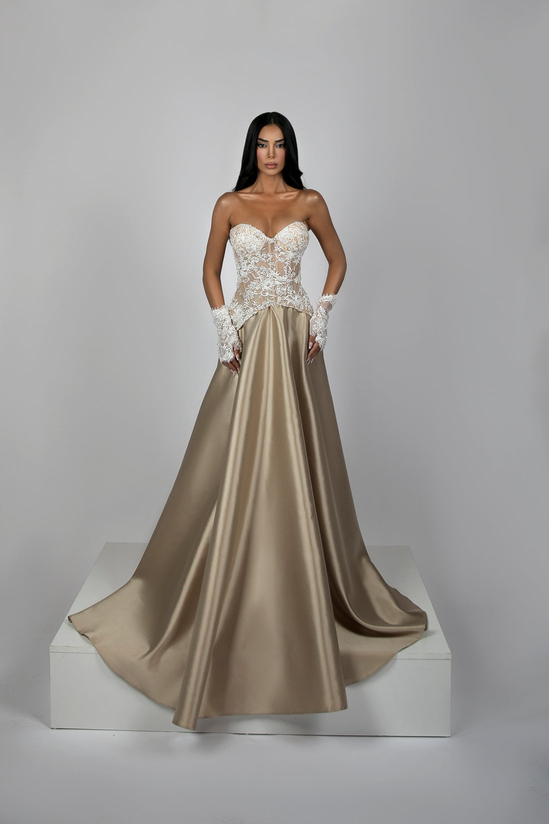 Long strapless gown Sweetheart design Lace detailing on the bodice Flowing champagne skirt Short lace...