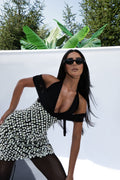Crafted from a sleek black fabric, this mini dress features a deep V-neckline with off-the-shoulder straps. The skirt is adorned with large white stones embellishments. Styled with black sunglasses to complete the chic look.