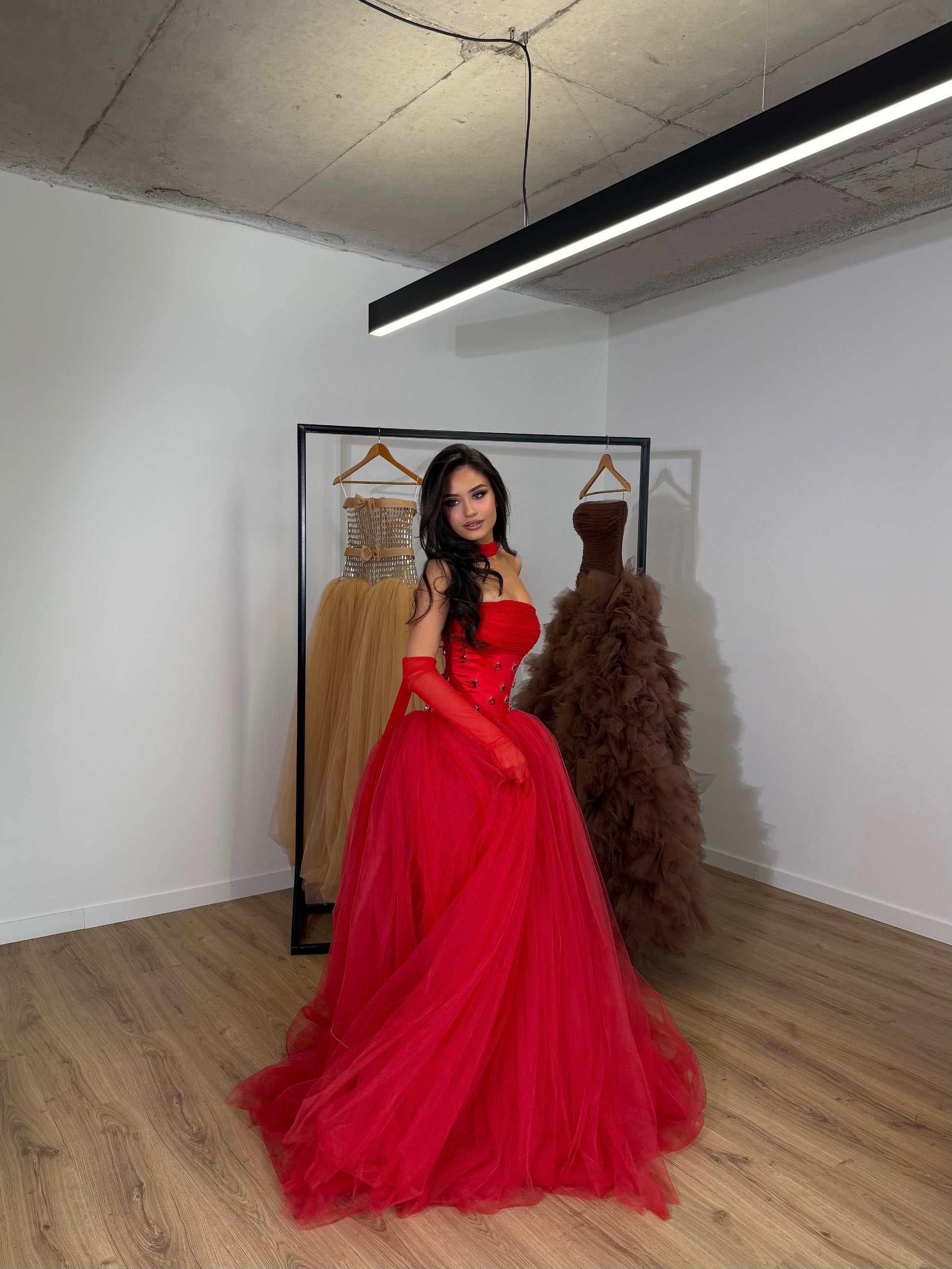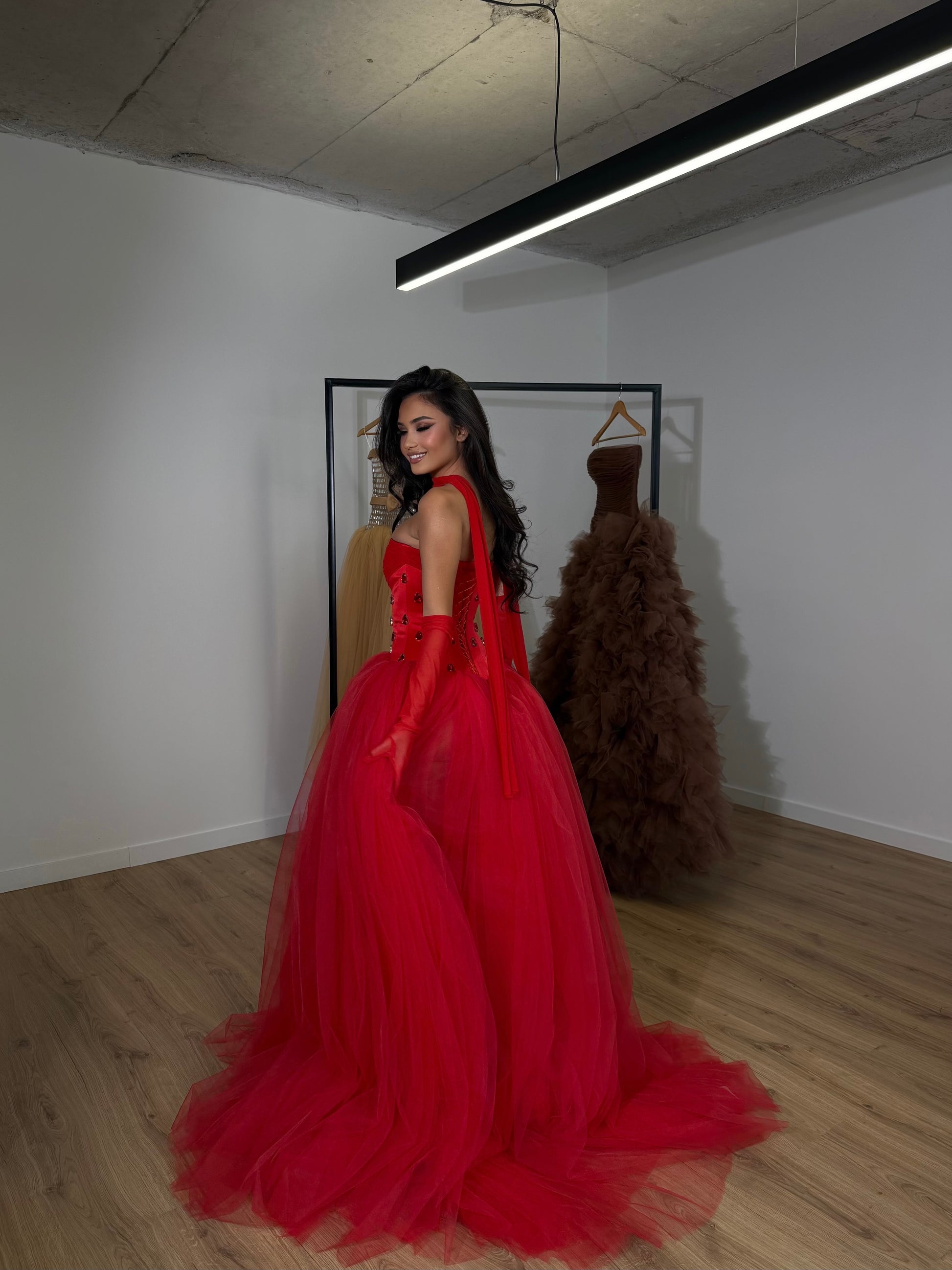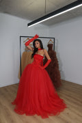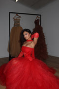 - Vivid scarlet red tulle gown