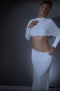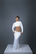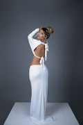 Boasting a high neckline and a captivating backless tie top, this ensemble exudes sophistication and charm. The high waist skirt adds a flattering touch, flowing gracefully to a floor-length hem for an effortlessly elegant look.