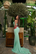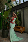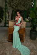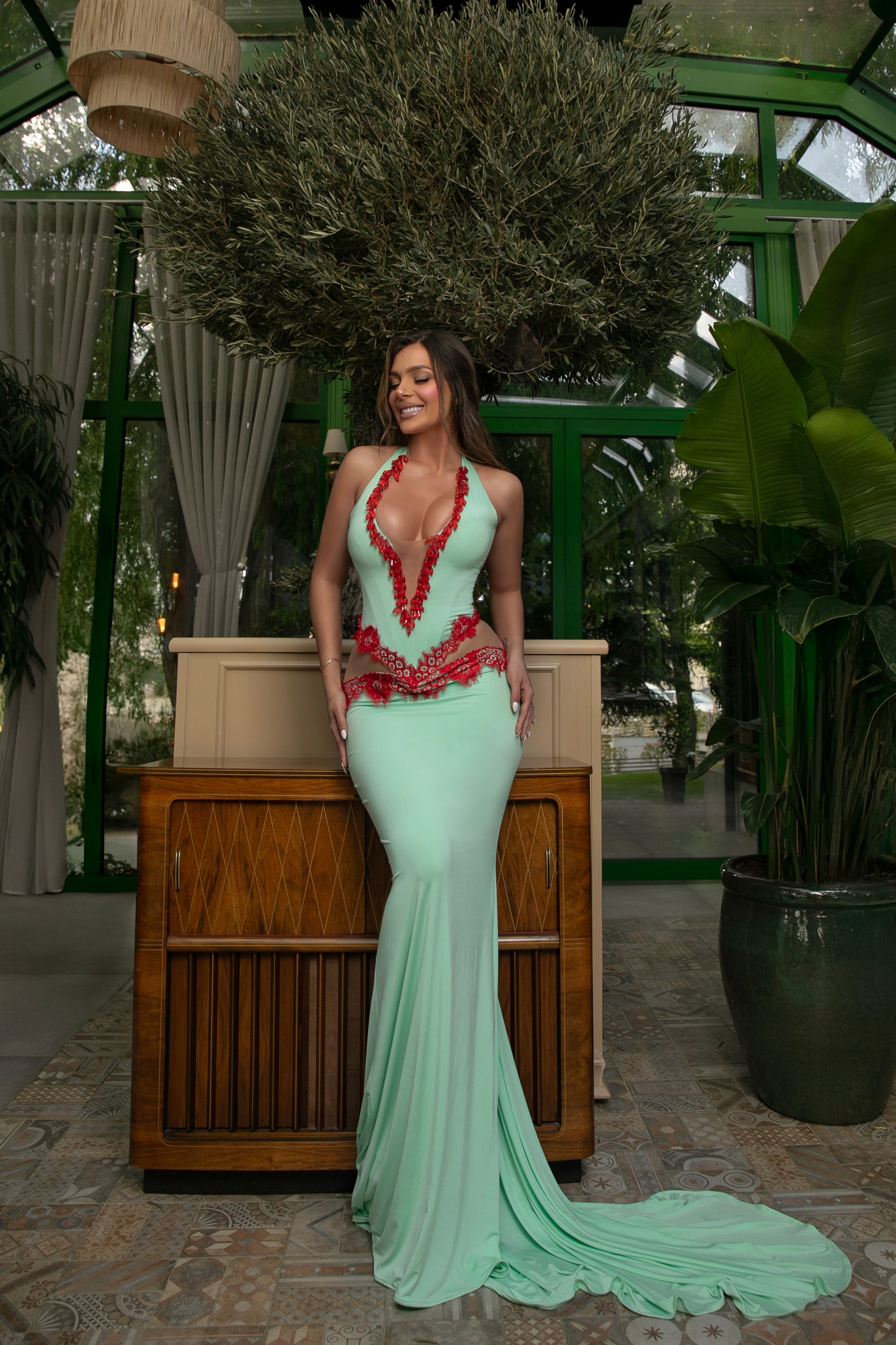 - Rich red embroidered lace appliqué along the neckline and waistline