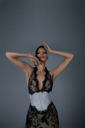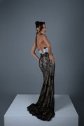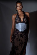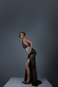 This halterneck dress has a plunging cowl neckline, evoking the minimal yet sexy spirit of the collection. The dress is kept simple with its floor length and side slit design.