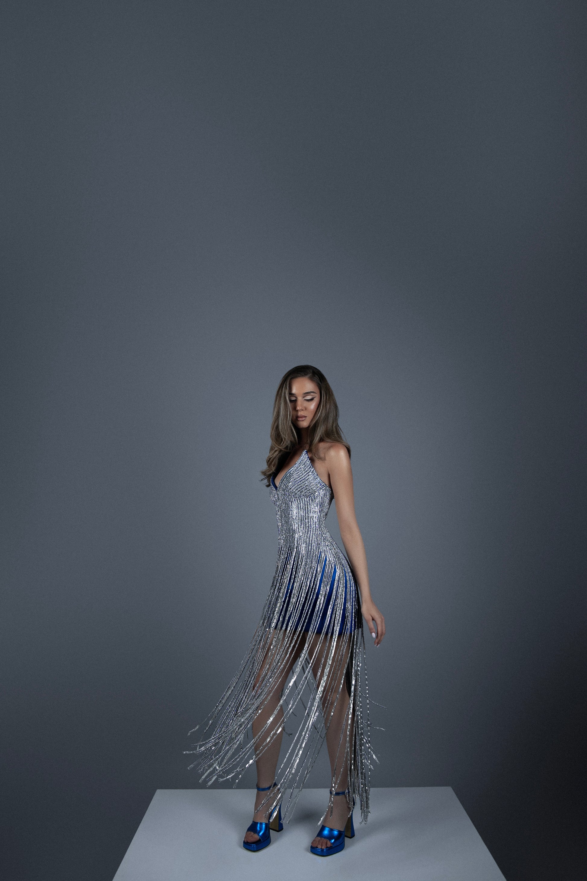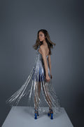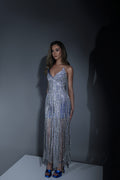 This gown is a celebration of craftsmanship, meticulously adorned with luminous beadwork that captures the essence of luxury.The sleeveless design elegantly frames the shoulders, offering a glimpse of grace with every movement. Engineered for sophistication, the fitted bodice seamlessly transitions into a gently flared hem, creating a silhouette that is both graceful and universally flattering. Beneath the surface lies a layer of delicate blue fabric, a subtle nod to the brand’s attention to detail and commitment to comfort without compromising on style.