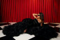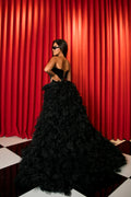 Make a grand entrance in this strapless black gown. Featuring a fitted bodice, high leg slit, and a voluminous ruffled tulle skirt, it’s designed for dramatic flair and elegance