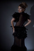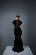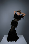 Adorned with delicate feathers along its high neckline and short sleeves, this dress exudes an air of refined elegance. Crafted from luxurious black tulle fabric, its floor-length design adds a touch of timeless sophistication to any occasion.