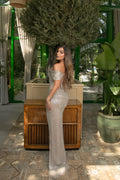 Champagne Off Shoulder Glitter Gown with Thigh Slit and Draped Waist