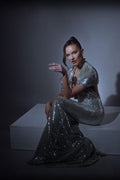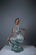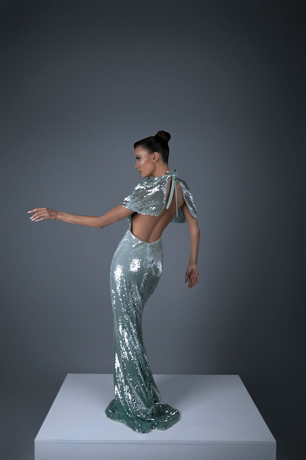 Showcasing a chic plunge neckline and halter neck fastening. Its sophisticated backless design and sleek silhouette transition effortlessly from romantic evenings to dinners, ensuring you shine with grace and allure.