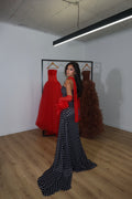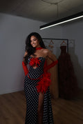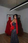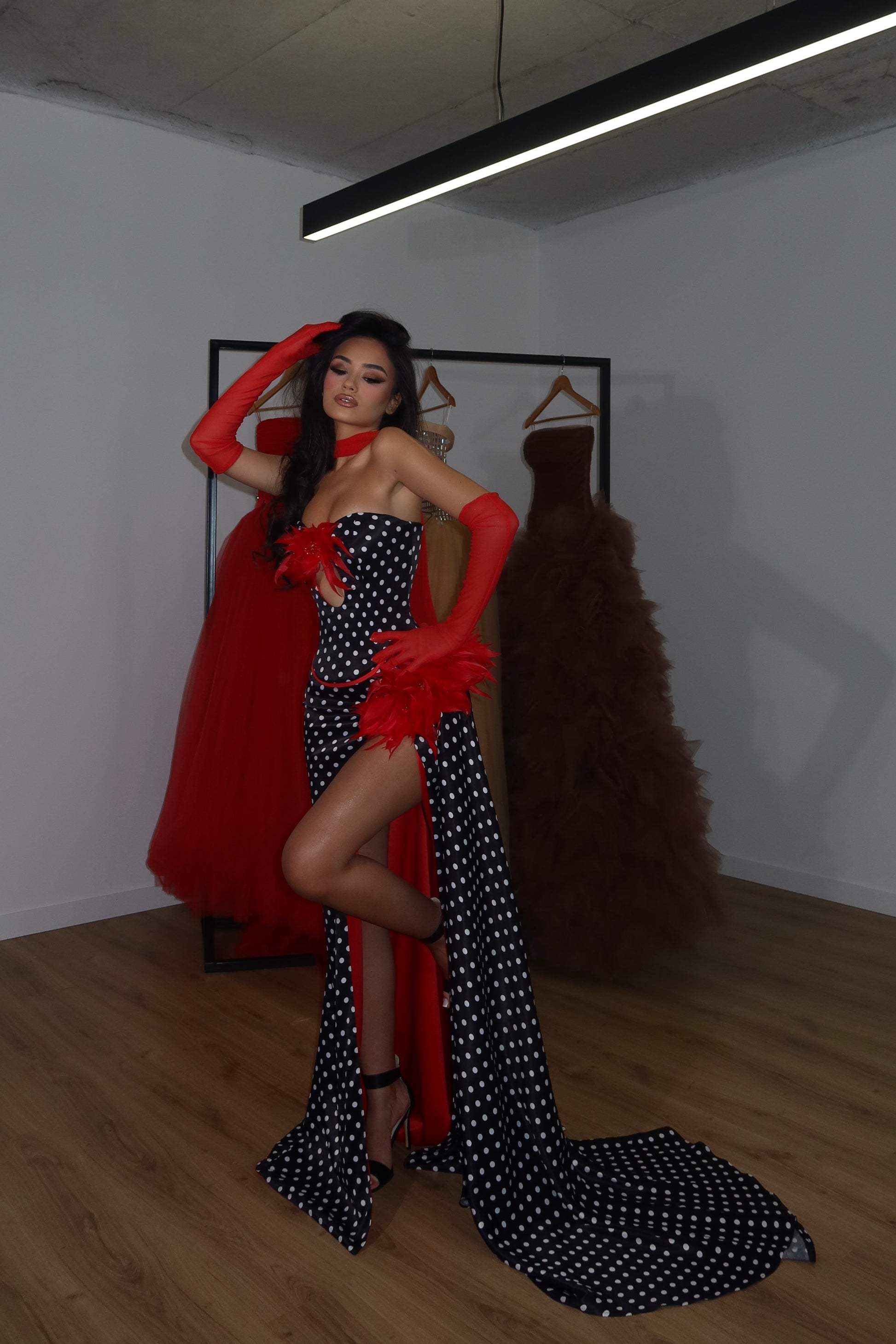 - Paired with sheer red gloves and a scarf for full pin-up fantasy