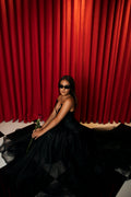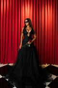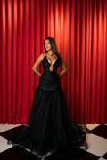 Featuring a deep V-neckline, fitted bodice, and a flared, layered tulle skirt, it’s perfect for making a memorable entrance